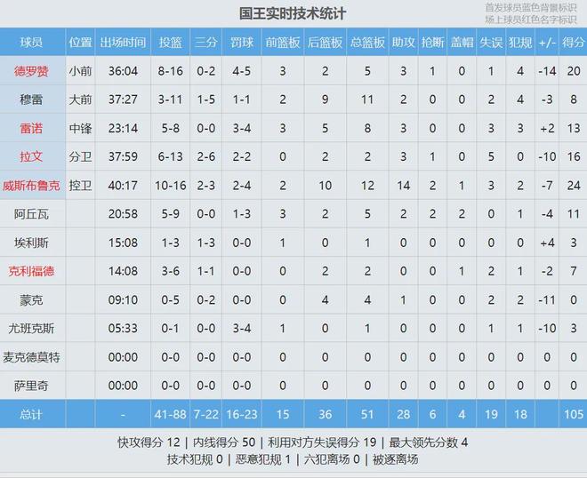 可惜国王的防守太差了,拉文也频频出现失误,第四节国王全队仅得17分。此役拉文13中6,得到16分2板3助5失误。到了第四节关键时刻,国王的球权都在拉文跟德罗赞手里,威少拿不到球。只能说国王这支球队,彻底没救了。